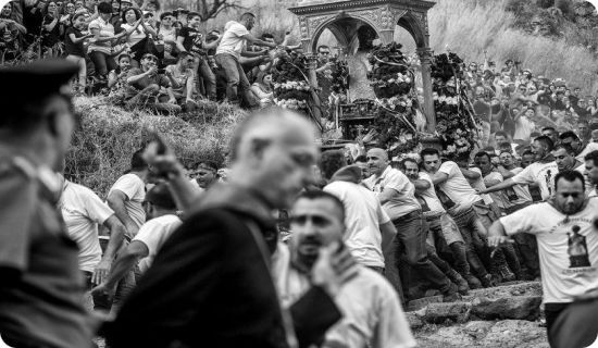 D’où ces rites complexes, chargés de contenus et de symboles, qui se sont stratifiés au cours des âges et que Finocchiaro évoque dans ces prises d’où jaillissent la dévotion au Christ et les rituels païens en des célébrations impressionnantes.