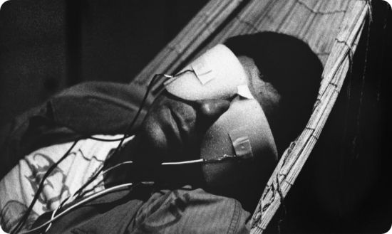 Ce « ciné-roman », un collage de rectangles-images en noir et blanc, commence d’une manière violente. Un homme, interprété par l’acteur Davos Hanich, dont le récit diégétique est porté par une voix off, celle du récitant, Jean Negroni, est fait prisonnier, ligoté, masqué. Ce n’est qu’au prix de tortures insupportables infligées par des scientifiques froids (en vérité des bourreaux), du paroxysme de la souffrance que vont avoir lieu des voyages cosmographiques.